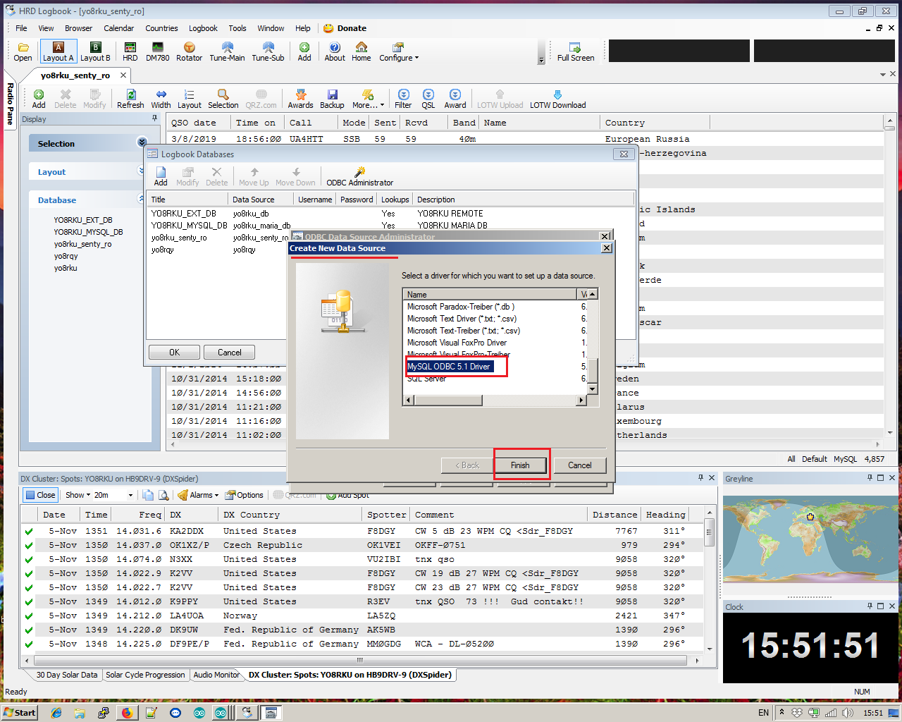 Disclaimer: prezentul articol nu este o noutate, nu s-a re/inventat roata si nici apa calda. Articolul este dedicat celor cu mai putine cunostinte decat expertii; celor lipsiti complet de bagajul minimal in domeniul IT nu le ramane decat sa ceara ajutor celor mai experimentati sau sa foloseasca alte cai pentru a tine logul. Cine detine pachetul Ham Radio Deluxe, are posibilitatea de a tine logul in format electronic prin aplicatia HRD LogBook. Avantajele unui log electronic sunt mult mai numeroase fata de cel clasic, pe hartie. Electronic avem posibilitatea de a introduce legaturile automat din diferite programe de lucru, putem afisa instantaneu daca am avut sau nu vre-o legatura cu o anume statie, tara sau continent, in fine... este un pas spre progres. Un avantaj este faptul ca putem avea un singur log (adica o singura baza de date) si mai multe puncte de lucru. Nefiind pasionat de concursuri, nu am testat si nu am cunostinte despre cum se comporta subiectul (adica HRD-ul), in asa ceva, dar pentru lucrul obisnuit la statie, este un plus sa poti avea programul HRD LogBook pe mai multe calculatoare, si indiferent pe ce PC lucrezi... sa ai toate legaturile intr-un singur punct. Pentru a intelege mai bine, e cazul sa aduc aminte ca fiecare program de log, isi face un fisier in care sunt stocate toate legaturile introduse. Practic daca instalam aplicatia pe mai multe pc-uri, pe fiecare pc va fi o alta baza de date, baza ce nu este "sincronizata" cu alta de pe alt pc. Solutia este ca baza de date sa fie comuna, pe un dispozitiv care sa fie in permanenta pornit si accesibil cand este nevoie. Pe plan local (intr-o retea LAN), treaba este mult mai usoara si mai rapida, chiar daca am folosi acelasi fisier (baza de date) care sa fie impartit de mai multe PC-uri (fiecare cu programul lui instalat). In concluzie, putem avea o baza de date comuna mai multor aplicatii (programe) de log, baza de date fiind stocata in reteaua interna sau intr-un datacenter (extern). De ce avem nevoie si cum incepem? Avem nevoie de un dispozitiv care sa tina baza de date. Acest dispozitiv poate fi un PC care va juca rol de "server", sau chiar un server intr-un datacenter (pentru cine are acces, cunostinte, etc). In retea interna (LAN/VPN), personal am "hacuit" si un banal router pe care l-am transformat intr-un micro server, pentru nevoi personale isi face datoria cu brio, chiar daca acum tin baza de date pe un hosting alaturi de site-ul propriu. Pentru inceput, pe dispozitivul care va fi "server" va trebui sa instalam o baza de date, cel mai popular fiind mysql-ul. In functie de ce SO (sistem de operare) rulam pe host (server), va trebui instalat "serverul" mysql pe win, unix sau alte sisteme. Personal, pentru win folosesc MariaDB intrucat mi s-a parut mult mai "prietenos" in comparatie cu MySQL; sub mediu Unix prefer mysql-ul, HI. Dupa instalare si configurare, se pot crea bazele de date, tabele, useri, etc folosint interfata de comanda in linie. Daca host-ul mai ruleaza si un server web + php, putem accesa serverul sql si prin phpmyadmin. Pentru accesare si lucrul pe serverului mysql de pe un alt PC, putem sa instalam pe acel PC un mic progam, HeidiSQL, asta in special cand avem acces la un server mysql dar fara acces la httpd si php (serverul web si php). Avem instalat si acces pe serverul mysql... indiferent ca acesta este local, pe un alt PC, sau extern... undeva prin lume. Pe PC-ul pe care am instalat suita HRD si implicit HRD LogBook, va trebui sa mai instalam un conector ODBC, care va lega baza de date externa de programul de log. Urmatorul pas este configurarea aplicatiei HRD LogBook pentru a se conecta (prin conectorul ODBC) la baza de date externa. Pentru aceasta vom urma pasii: Ultimul pas, dupa ce am inchis toate ferestrele si configurarea a luat sfarsit, este sa afisam pe panoul de lucru cu ce baza de date vom lucra. Pentru aceasta, nu ne ramane decat sa mergem pe al doilea tab de sus si sa apasam pe butonul "Open". Se va deschide o mica fereastra (Select Database), de unde alegem ce baza de date vom folosi pentru a introduce legaturile. Casuta se va inchide cu un OK si setarile au luat sfarsit. Daca nu mai avem alte baze de date atasate la HRD Logbook, se va deschide o fereastra de log goala. In final, acum putem sa importam un eventual backup, sau sa incepem sa bagam legaturi in log. La acest pas ar mai fi de spus ca daca avem mai multe indicative, de aici putem selecta "cu ce indicativ lucram", astfel incat sa nu amestecam legaturile. Cand avem un alt pc in alta locatie sau un laptop pe care-l folosim in portabil, nu ne mai ramane decat sa instalam si pe acesta suita HRD si sa configuram HRD LogBook ca in exemplul de mai sus, in felul acesta ce legaturi vom introduce de pe un PC, se vor regasi si pe celalalt(e) PC(-uri). apoi va bifa casuta si va alege timpul de refresh. Un Ok si asta a fost tot; acum daca lucreaza mai multi useri pe acceasi baza de date (pe acelasi indicativ) fiecare user va vedea si ce legaturi a introdus celalalt coleg. Trebuie mentionat ca optiunea va merge mai greoi cand se foloseste o baza de date externa (intr-un datacenter sau in afara retelei locale), deci nu puneti mari sperante daca folositi logul in vre-o competitie sau expeditie. Pentru cine are mai multe cunostinte in domeniu, mai putem aminti ca o baza de date mysql externa (eventual pe un hosting web) poate fi folosita si la afisarea pe propriul website a legaturilor facute, totul in timp real; cum se inscrie in log o legatura noua, ea e "trimisa" imediat pe serverul mysql, iar de acolo... pagina web preia informatia si o afiseaza pe un site. Cum spuneam si mai sus, HRD LogBook e capabil sa lucreze si cu baze de date externe pe diferite pachete de webhosting, dar este necesar ca si firma care ofera hosting sa permita accesul din exterior, altfel... serviciul e null. In final va multumesc pentru atentie, 73 to all!