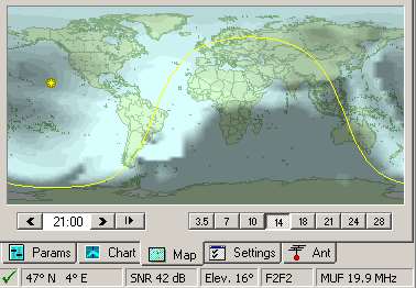 deschidere in 20m catre EU si NA la apus; se poate observa si path-ul gray line catre OC si AS de SE (HamCap) Schema propagarii fiind bine cunoscuta, trebuia gasita o strategie de lucru care sa asigure in acelasi timp si o rata crescuta de legaturi, dar si un influx continuu de multiplicatori pentru mentinerea unui scor ridicat. Altfel spus, statia A trebuie sa faca running permanent, dar in acelasi timp sa lucreze permanent multiplicatorii introdusi in bandmap de la statia B, care functineaza ca un DX cluster. Studiul logurilor WRTC 2002 ne-a aratat ca este mai eficient lucrul multiplicatorilor imediat ce apar in band map, deci lucrul intercalat runnind - S&P, decat asteptarea realizarii unei liste de multiplicatori si vanarea acestora pe rand. Insa prima varianta necesita mult antrenament cu liniarul la QSY-uri rapide si reveniri pe frecventa de running (toate echipele au primit ACOM 1010, liniar ce se acordeaza manual). O alta miscare cheie care trebuie avuta permanent in vedere este mutarea multiplicatorilor in alte benzi, mai ales a celor rari, stiut fiind faptul ca este prea putin probabila intalnirea intamplatoare pentru a doua oara in alta banda cu acea statie (de exemplu OY, sau VE4, etc.).