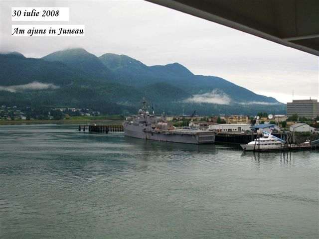 Asadar astazi, in ziua a patra, avem programata pentru ora 7 dimineata sosirea in Juneau, capitala statului Alaska. Este interesanta rivalitatea si totodata competitia intre Juneau si Anchorage pentru stabilirea capitalei. Anchorage este un oras modern, reconstruit aproape in totalitate dupa cutremurul din 1976, dar are dezavantajul amplasarii intr-un golf care are o maree foarta inalta [aproape 11 m] si care si ingheata peste iarna, asa ca sansele ca sa devina capitala sint minime, totusi oamenii au o preocupare si se zbat pentru nominalizare. Deocamdata capitala nu se muta de la Juneau.