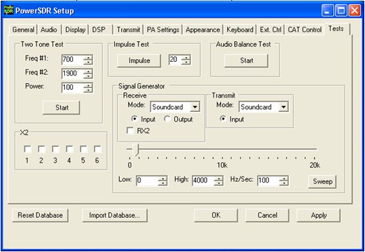 Pentru testare am folosit intensiv facilitatile de testare integrate in PowerSDR. Programul a fost conceput de la inceput cu aceasta functionalitate, care da posibilitatea efectuarii unor reglaje cu acuratete maxima si, in plus, lasa experimentatorului posibilitatea sa testeze diverse tipuri de modulatie sau sa faca o baleiere a intregului spectru de frevente transmise, pentru a vedea liniaritatea in amplitudine.