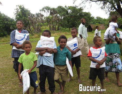 Apoi, impărţirea de plase contra ţânţarilor, tratate special pentru 5 ani de zile sub care se pot adăposti şi dormi în medie 10-15 copii mici, şi care, le oferă protecţie contra malariei care se propagă prin înţepăturile ţânţarilor. Am văzut multe lacrimi de bucurie la primirea plaselor de ţânţari, mulţi spunându-ne că...de acum copiii lor sunt în siguranţă şi nu vor mai muri...( rata mortalităţii la copiii este foarte mare din cauza malariei, în insulele Pacificului la fiecare 30 de secunde moare un copil de malarie) şi mă gândeam la copiii noştri care în pauzele dintre ore merg la chioşcurile din curtea şcolii şi cumpără fel de fel de ...bunătăţi şi care dacă ar renunţa la ele cel puţin o lună cu banii economisiţi ar putea cumpăra câteva plase şi la câţi copiii avem...am putea să oferim o şansă de viaţă multor copiii care nu se pot bucura ca ai noştri.