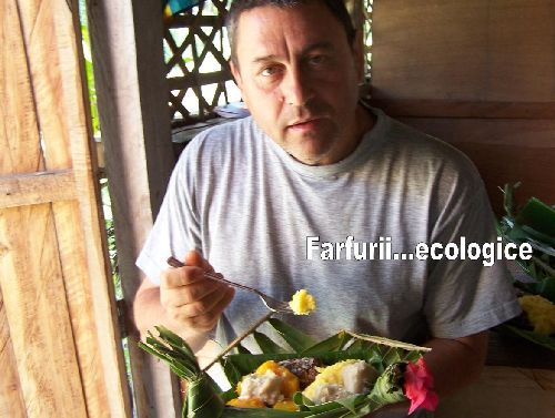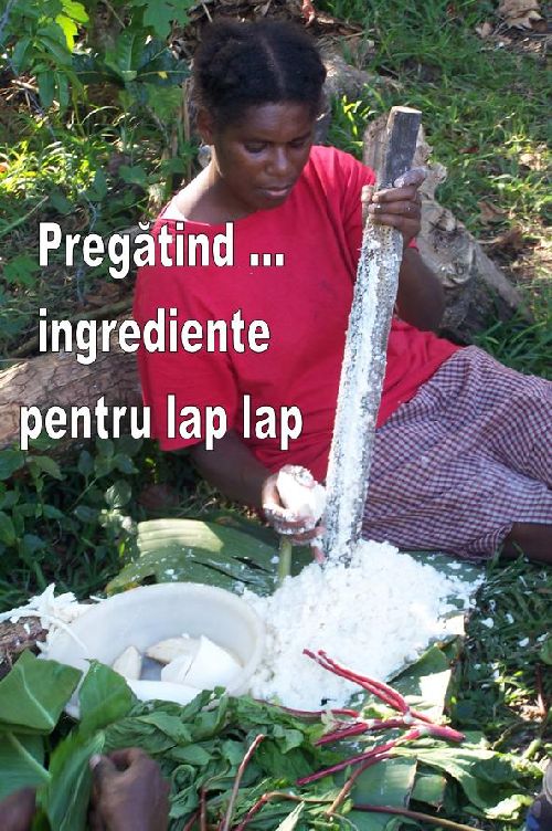 Mâncarea tradiţională a lor este lap-lap-ul. De regulă se prepară din banane crude, tăiate felii sau pur şi simplu rupte, din banane coapte ( pe insula Tanna am descoperit 8 specii de banane, unele se pot manca aşa cum sunt cele ce le cumpărăm din market, altele se pot consuma numai fierte, altele coapte, etc...) rădăcină de yom, manioc ( rădăcini albe şi dulci) taro ( fiartă are gust de humă), bostan, frunze de varză sălbatică, etc... Unele se rad pe un fel de răzătoare altele doar...tocate. Se amestecă, se întinde acest aluat pe frunze de banan, apoi se stropeşte cu lapte de cocos, se împachetează bine cu frunze de banan, se leagă cu liane subţiri. Bărbaţii, în timp ce femeile pregătesc mancarea, pregătesc focul. Sapă o groapă asemănătoare unui fund de ceaun mare, în care se pun multe pietre mari peste care se pun lemne şi se dă foc. Se face foc până pietrele se înroşesc. Apoi, cu bucăţi de nucă de cocos sau bambus, se împart pietrele în două. O parte se lasă în groapa săpată se aşează frumos peste care se pun "plăcintele" pregătite de femei. Unele peste altele, sau cand se pregăteşte doar pentru familie, una singură dar mare. Apoi peste ele se pun celelalte pietre înroşite, apoi frunze de banan, şi pământ. Acesta este "cuptorul cu microunde" al lor unde pregătesc piţa...La gust...nu e de mâncat...e cleioasă, lipicioasă, fără gust, etc, Unele femei fac un fel de ...sarmale din aceleaşi rădăcinoase învelite în frunză de varză sălbatică. Nu în bucătărie se face asta ci...la umbra copacilor. Şi dacă o femeie are o ...problemă de rezolvat, merge după un copac, rezolvă problema, scutură mâinile sau se şterg de o frunză şi...continuă treaba. Şi, daca eşti invitat la masă la această familie ce avusese...probleme pe care le vezi şi nu mănânci, nu mai vorbesc cu tine pentru că te consideră... "fudul". Au nevoie să te cobori la nivelul lor. Dar, din aceleaşi ingrediente se pot pregăti bucate foarte gustoase. Bucătăresele noastre, într-o zi de exemplu au pregătit un fel de... salată beof. Ornată cu frunze, cu lapte de cocos...frumoasă, mai ales când ţi-e foame. Deodată apare soţia şefului de trib şi când vede....salata cât o roată de căruţă de mare ( eram câte odată 30 de guri la masă), a ieşt repede afară privind în golf şi întrebând: