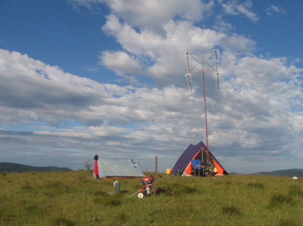 Am ajuns pe virf... ASL 948m. A fost vint destul de puternic, dar cu soare, nu prea cald. S-a instalat prima data "bateria" de 4 antene pentru 432 MHz, corturile,apoi bineinteles ca pe un vint mai tare, de creasta, am incercat sa instalam cortul pentru 144 MHz .Dar fiind un cort de ...campie, am avut norocul ca nu am fugit dupa prelata...spre vale... Am fixat cortul- o improvizatie, cu crengile pe care le-am gasit in apropiere, dupa cum se vede intr-una din poze. In fine, se instaleaza generatorul de curent, mesele de concurs si ...restul echipamentelor .