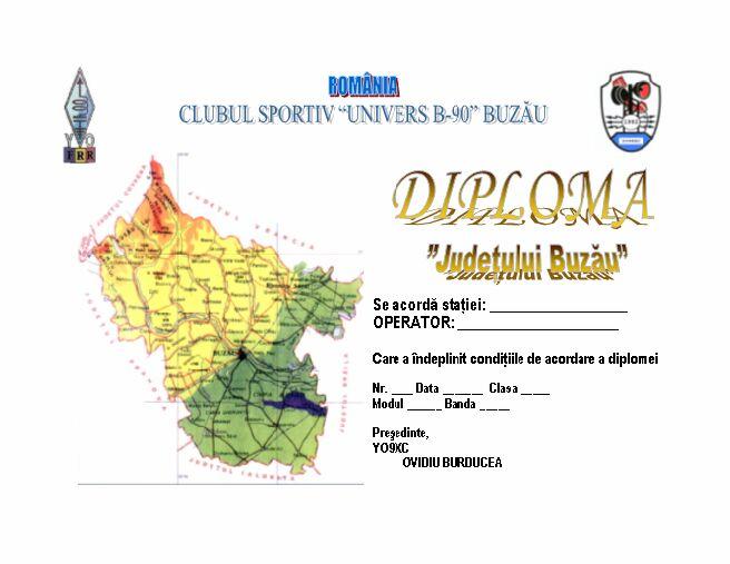 Diploma “JUDETULUI BUZAU”,  se elibereaza anual, in trei clase, astfel:-U.S.-QSO-uri pentru clasa I-a cu 6 statii, pentru clasa a-II-a cu 5 statii si pentru clasa a-III-a cu 4 statii din judetul Buzau, la care se adauga QSO-uri cu cate o statie din judetele vecine: Brasov, Covasna, Vrancea, Braila, Ialomita, Prahova. (12, 11, 10 QSO-uri).