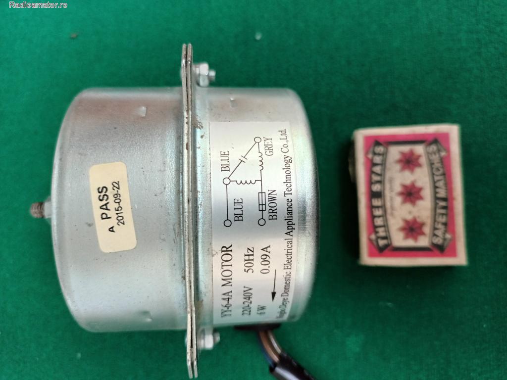 | Vand un electromotor tip YY-6-4A , 220 -240V/90 mA., gabarit Ǿ70 x 61 mm. (exclusiv sistemul de fixare ) , ax Ǿ5x15 mm, cu filet M5x10 mm. Greutatea este 850 g. Electromotorul are un condensator de pornire exterior de 0, 5 µF/450Vc.a., si este perfect functional.