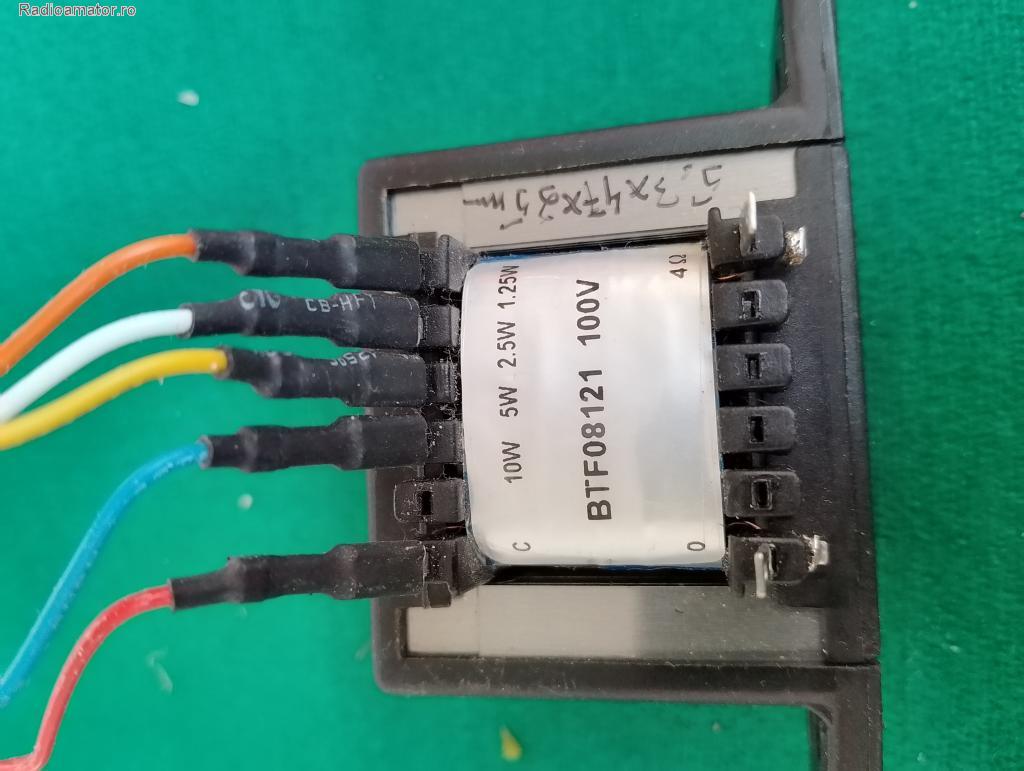 | Vand un transformator de iesire/ adaptare, fabricatie Bosch, recuprat, care are o infasurare marcata 0 – 4 Ω si o alta infasurare, cu 5 terminale, marcate 0 – 10W- 5W -2,5W – 1,25W, asa cum se poate observa si din poza anexata. Am masurat raporturile de transformare dintre cele doua infasurari, rezultand n=15 pentru 10W, 25 pentru 5 W, 32 pentru 2,5 W, si 47,pentru 1,25 W. Sectiunea miezului este 2,5 cmp., iar gabaritul este 53x47x35 mm.