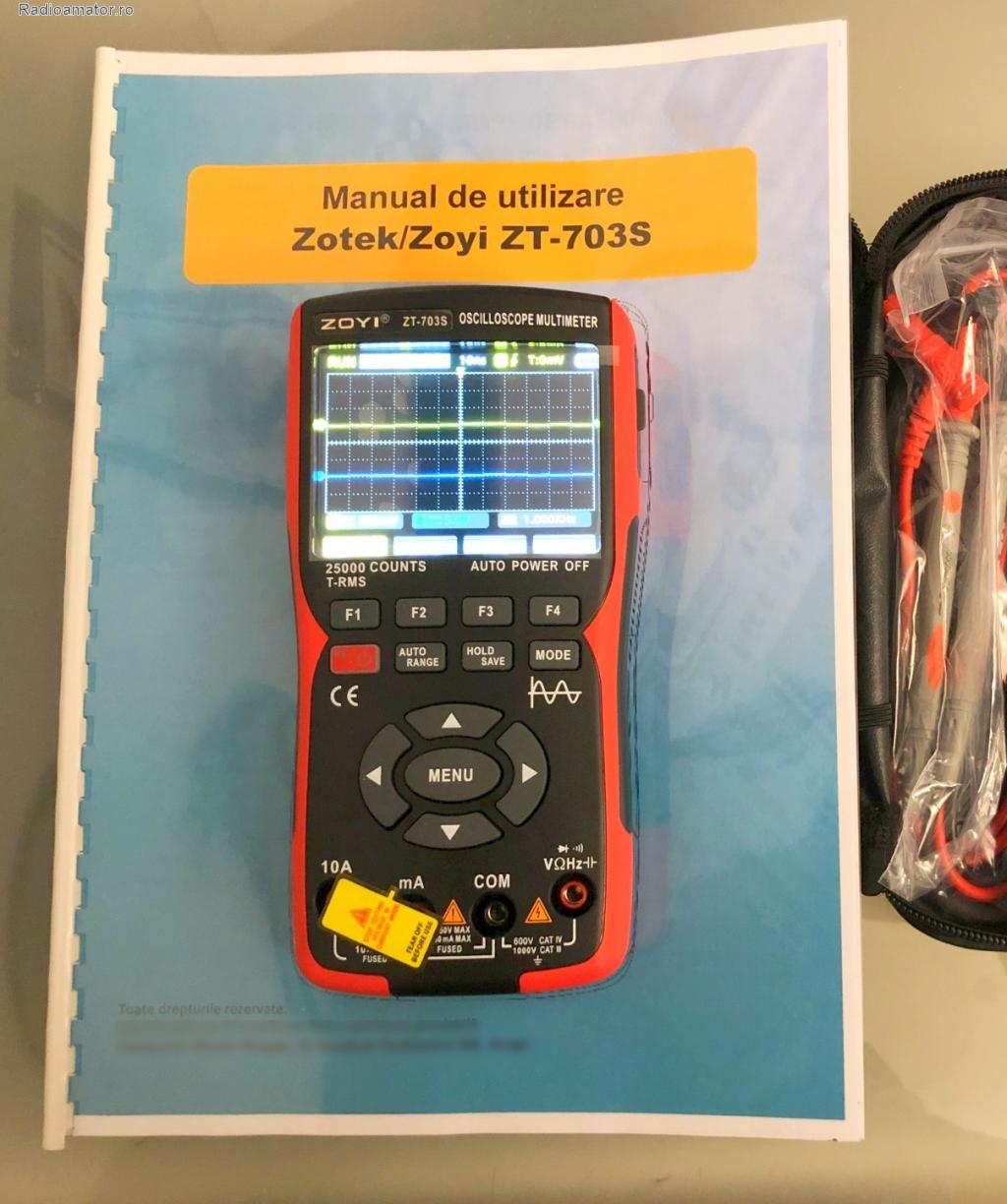 | De vânzare MANUAL ÎN LIMBA ROMÂNĂ pentru osciloscopul cu 2 canale Zotek / Zoyi / Aneng / BSIDE ZT-703S, respectiv cu un singur canal 702S. Manualele sunt diferite, deși la prima vedere arată similar; cele relatate în continuare se referă la ambele modele. Cel din imagine este pentru 703S.