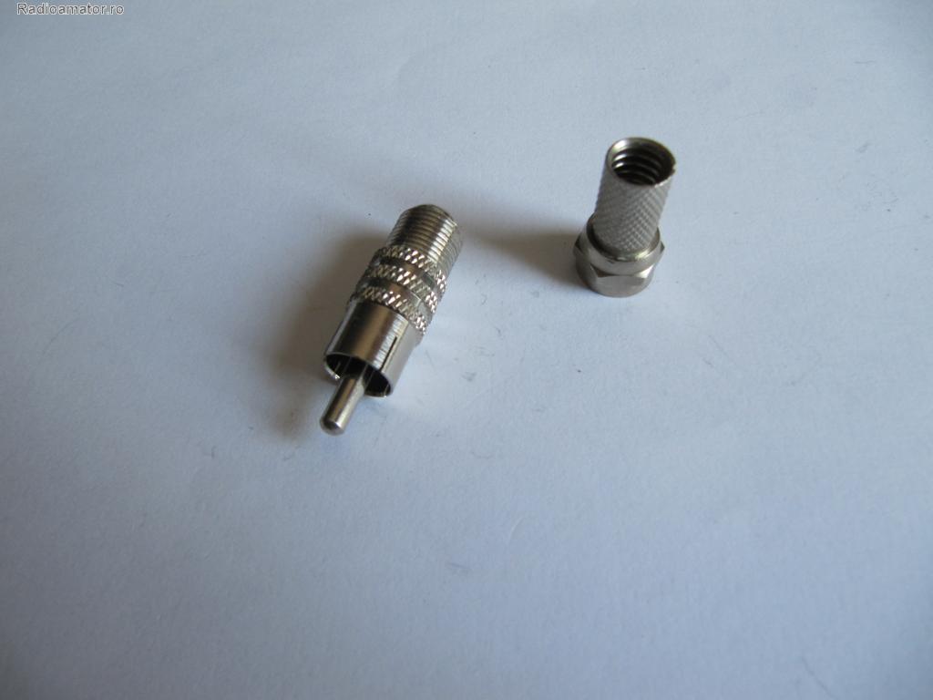 | Mufa RCA tata/ mufa F mama. Cea din stanga este mufa RCA tata/ mufa F mama, iar cea din dreapta este mufa F tata; mufa F tata este cadou.