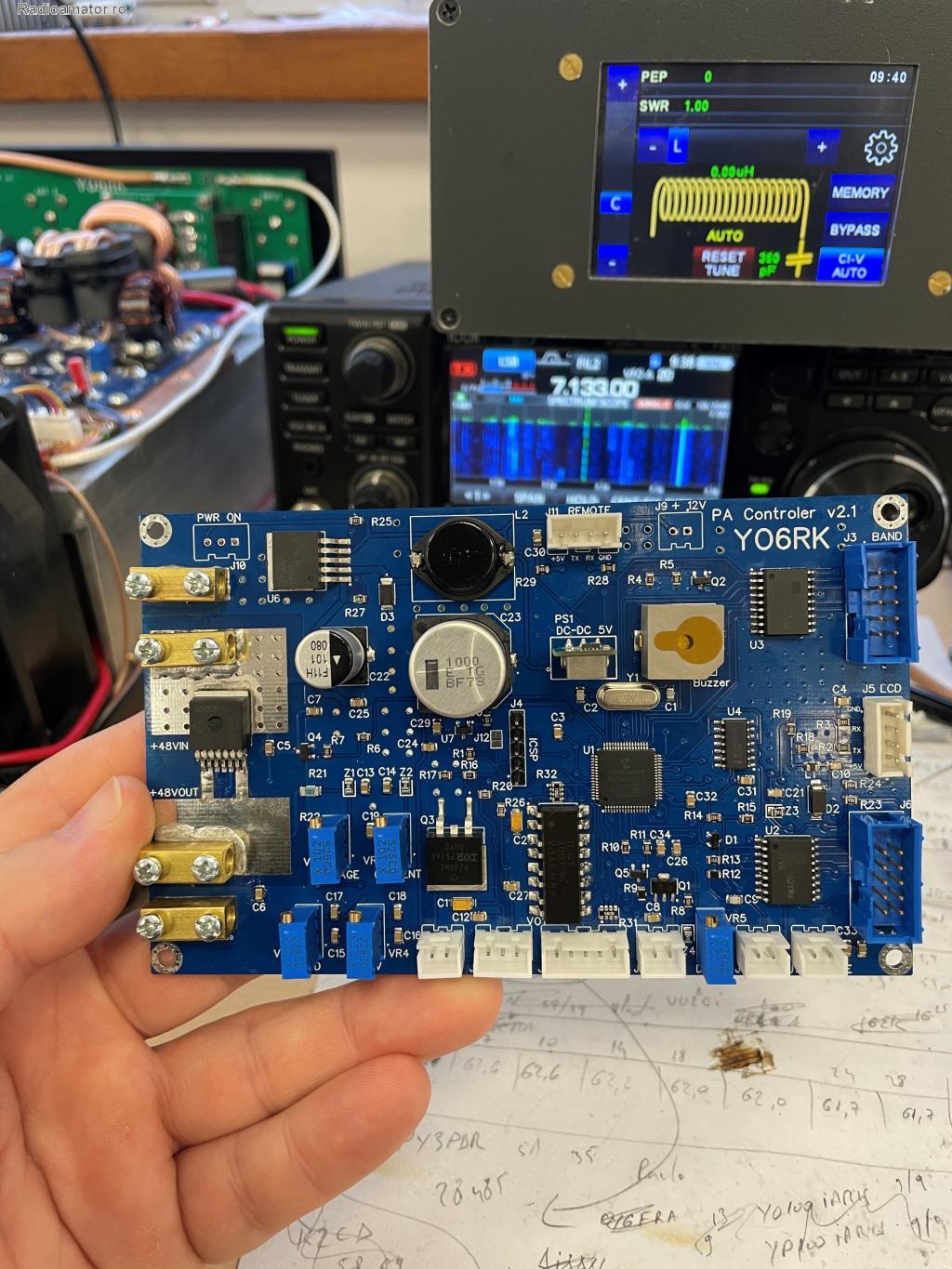 PCB conceput pentru montare stack impreuna cu un display nextion de 5 inch. Aceasta placa contine: - doua convertoare DC-DC (50V > 12V si 12V > 5V), un singur element de intrerupere a tensiunii de 50V pentru amplificator bazat pe BTS50085 - driverele de comanda pentru releele (LPF, RX/TX, Antena switch) - doi senzori de temperatura; doar unul are rol de protectie - iesire pentru "FAN MAX". - iesire BIAS (+12V) - intrare RF pentru decodare de banda - intrare tensiune ICOM pentru decodare de banda - intrare BCD (prin optocuplor) pentru decodare de banda YAESU - port intrare pentru protectie la depasirea puterii de intrare. Software, controlerul este conceput cu PIC18F6722. Acesta asigura protectia la depasirea puterii directe de iesire, a puterii reflectate, a puterii de intrare, la depasirea curentului si tensiunii de alimentare, la alegerea gresita a LPF-ului, sau la depasirea temperaturii maxime setate. Orice depasire de prag, opreste (prin secventiere) tensiunea BIAS si alimentarea de 50V. Prin software este asigurata si secventierea PTT/BIAS/Relay. Toti parametrii se pot seta dintr-un meniu. Afisarea se face doar pe display nextion seria intelligent de 5 inch, dar poate fi folosit si cu unul de 7 inch, rezolutia este de 800x480px. Folosirea unui display enhanced duce la pierderea unor functii grafice. Controlerul are un port pentru remote, iesirea este TTL. Se poate conecta un adaptor USB to TTL, lucrez la o aplicatie web api. Cel mai probabil in viitor voi porta aplicatia remote pe un ESP32 si va putea fi controlat prin WIFI & Web. Acest punct, in viitor, cand voi avea timp. Acest modul inlocuieste "n placi" responsabile cu mici functii cum ar fi decodor de banda, surse diverse de alimentare, comutatorul tensiunii de 50V in caz de avarie, etc... si o multime de fire :) Pret: 800 lei, transport inclus prin curier. Toate cele bune, YO6RK - Marius PS: daca vi se pare un pret mare, atunci mergeti pe dxworld si cumparati de acolo placa de protectie, placa de afisare, decodor de banda, surse... sigur iesiti mai ieftin :) | ||